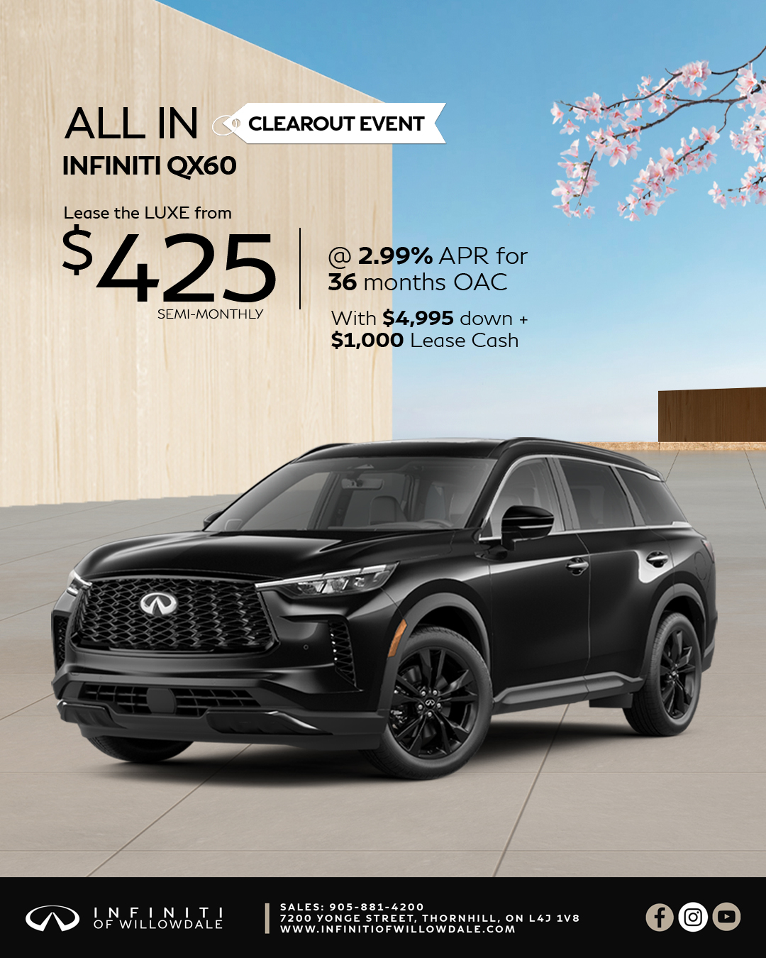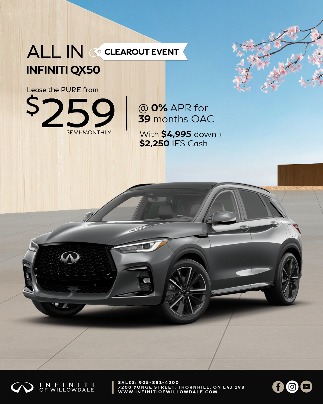 QX50 Pure: [*] Monthly payment is $ 509 and includes: $ 2495.00 freight and PDI; $ 100.00 A/C charge; regulatory fees of up to $ 22.00; dealer mandatory charges of up to $ 921.00; lien registration fees (including lien registering agent's fees, where applicable) up to $ 72.0 total;,Total lease obligation is $ 24,921.Offers available until midnight on April 30, 2026. Offers May change without notice. Certain conditions May apply. Retailer May lease for less. Retailer order/trade May be necessary (but May not be available in all cases). See your nearest INFINITI retailer for complete details.