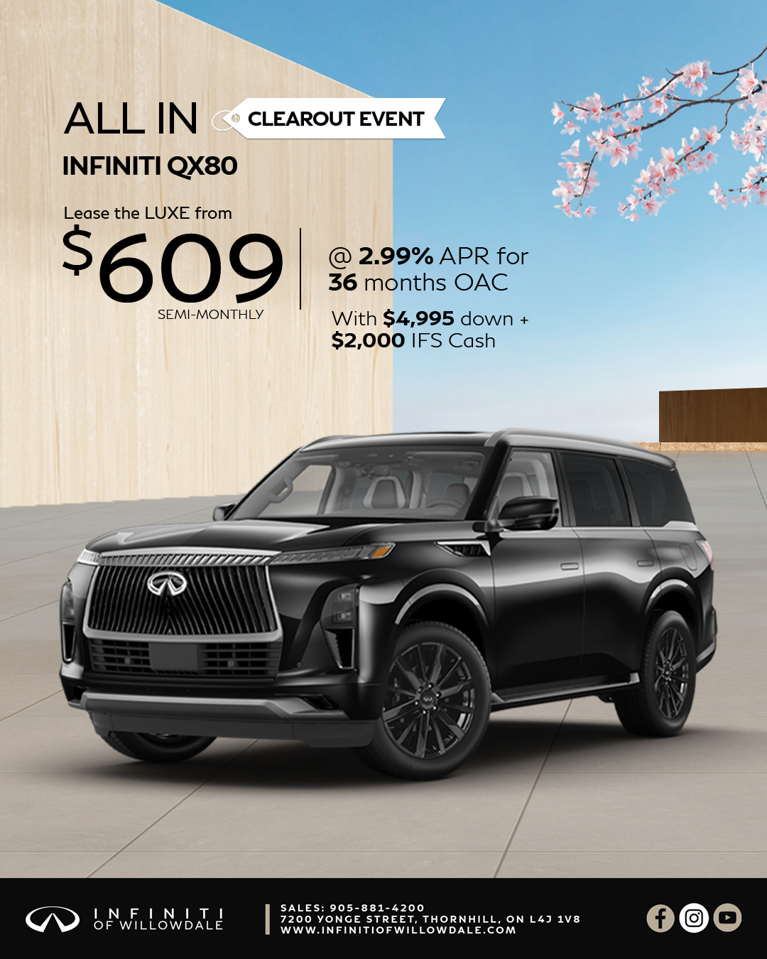 QX80: [*] Monthly payment is $ 1,211 and includes: $ 2495.00 freight and PDI; $ 100.00 A/C charge; regulatory fees of up to $ 22.00; dealer mandatory charges of up to $ 921.00; lien registration fees (including lien registering agent's fees, where applicable) up to $ 80.0 total;,Total lease obligation is $ 82,748.Offers available until midnight on April 30, 2026. Offers May change without notice. Certain conditions May apply. Retailer May lease for less. Retailer order/trade May be necessary (but May not be available in all cases). See your nearest INFINITI retailer for complete details.